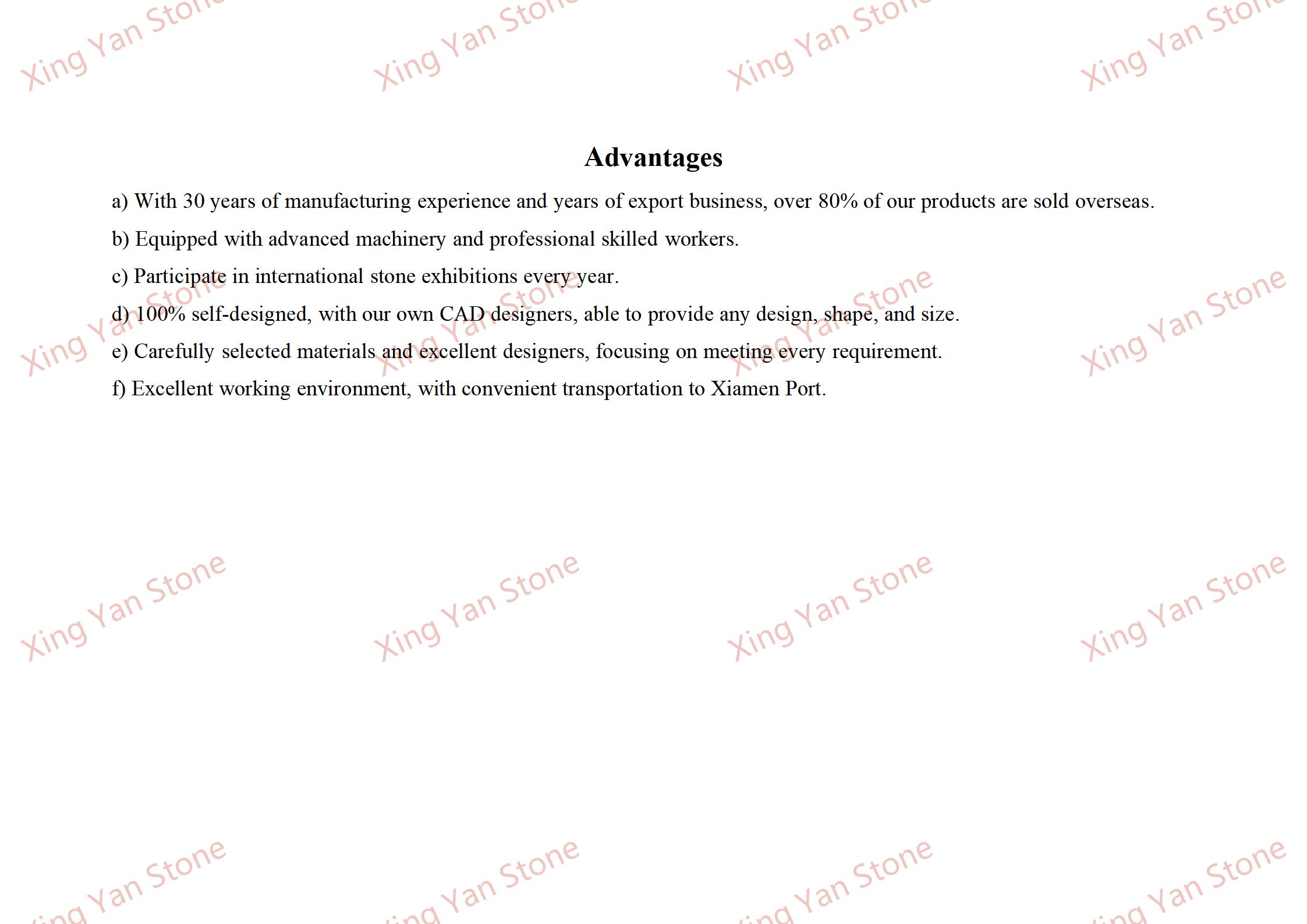 Materiál: Vybraná žula vysoké tvrdosti, tvrdá, odolná vůči povětrnostním vlivům a korozi, vhodná pro dlouhodobé venkovní konzervování. Pyšní se vysoce lesklým povrchem a jemnou, stabilní texturou.