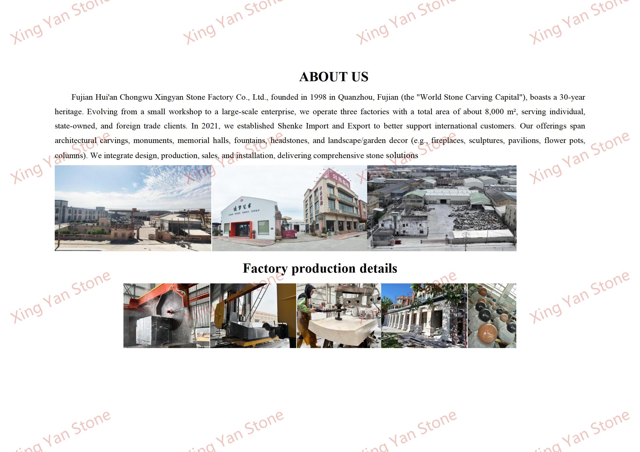 Služby přizpůsobení: Velikost a materiál sochy lze upravit podle požadavků (např. změna na jiné druhy žuly) a je podporováno gravírování textu (např. jméno, pamětní zpráva);