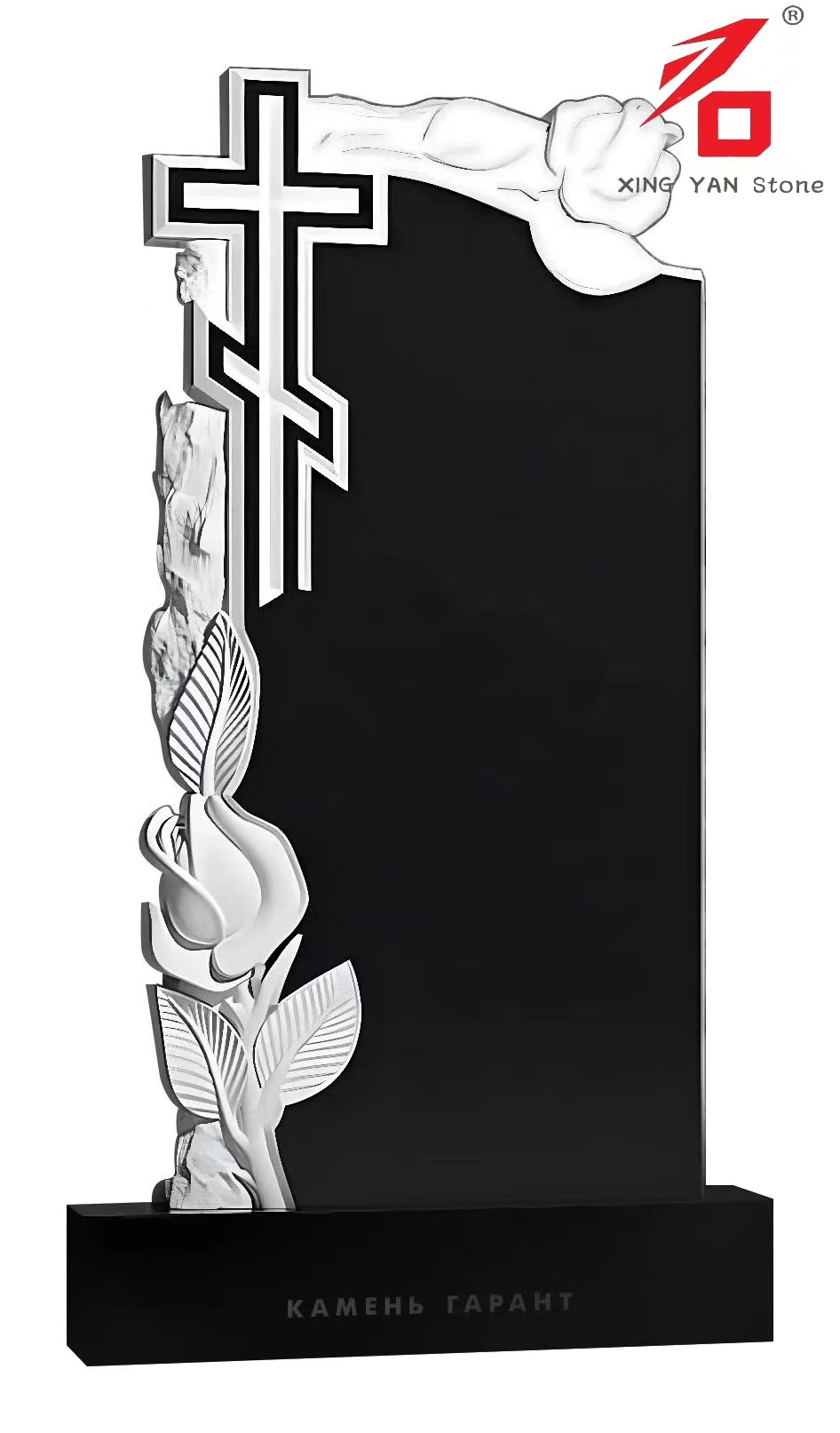 emoční výraz. Černá žula symbolizuje věčnost a hloubku, kříž